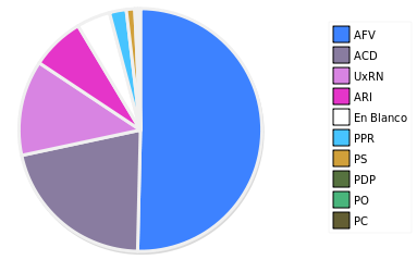 - Columna Porcentaje sobre Válidos no toma en cuenta los votos en blanco ni nulos (usado para D'Hondt de corresponder).