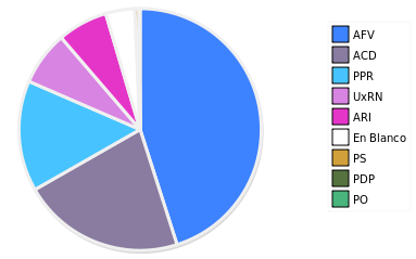 - Columna Porcentaje sobre Válidos no toma en cuenta los votos en blanco ni nulos (usado para D'Hondt de corresponder).