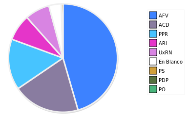 - Columna Porcentaje sobre Válidos no toma en cuenta los votos en blanco ni nulos (usado para D'Hondt de corresponder).