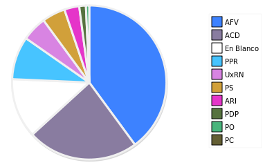 - Columna Porcentaje sobre Válidos no toma en cuenta los votos en blanco ni nulos (usado para D'Hondt de corresponder).