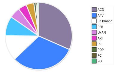 - Columna Porcentaje sobre Válidos no toma en cuenta los votos en blanco ni nulos (usado para D'Hondt de corresponder).