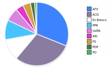 - Columna Porcentaje sobre Válidos no toma en cuenta los votos en blanco ni nulos (usado para D'Hondt de corresponder).