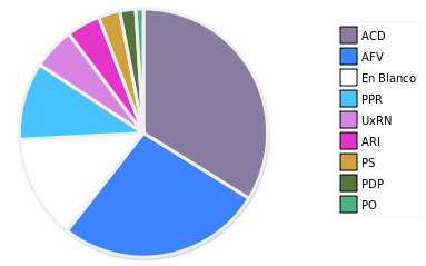 - Columna Porcentaje sobre Válidos no toma en cuenta los votos en blanco ni nulos (usado para D'Hondt de corresponder).