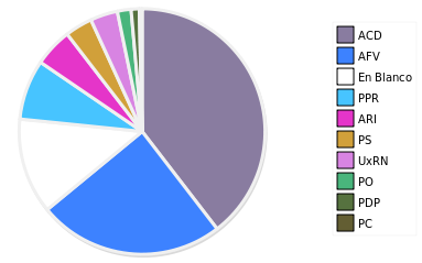 - Columna Porcentaje sobre Válidos no toma en cuenta los votos en blanco ni nulos (usado para D'Hondt de corresponder).