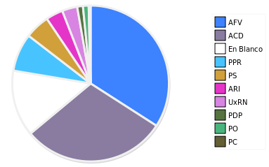- Columna Porcentaje sobre Válidos no toma en cuenta los votos en blanco ni nulos (usado para D'Hondt de corresponder).