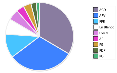 - Columna Porcentaje sobre Válidos no toma en cuenta los votos en blanco ni nulos (usado para D'Hondt de corresponder).