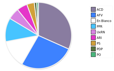 - Columna Porcentaje sobre Válidos no toma en cuenta los votos en blanco ni nulos (usado para D'Hondt de corresponder).