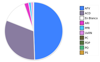 - Columna Porcentaje sobre Válidos no toma en cuenta los votos en blanco ni nulos (usado para D'Hondt de corresponder).