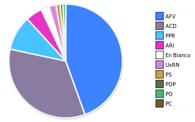 - Columna Porcentaje sobre Válidos no toma en cuenta los votos en blanco ni nulos (usado para D'Hondt de corresponder).