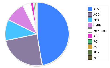 - Columna Porcentaje sobre Válidos no toma en cuenta los votos en blanco ni nulos (usado para D'Hondt de corresponder).