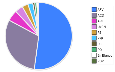 - Columna Porcentaje sobre Válidos no toma en cuenta los votos en blanco ni nulos (usado para D'Hondt de corresponder).