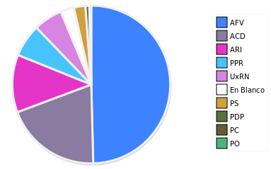 - Columna Porcentaje sobre Válidos no toma en cuenta los votos en blanco ni nulos (usado para D'Hondt de corresponder).