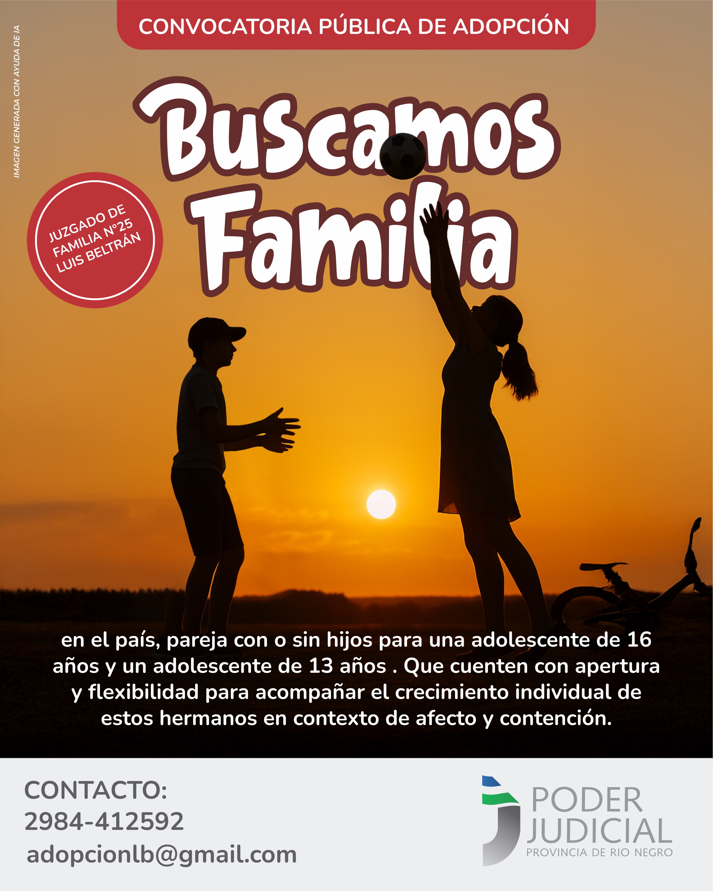 El Juzgado de Familia de Luis Beltrán , Provincia de Río Negro, a través del Registro Único de Aspirantes a Guarda con Fines Adoptivos, convoca a familias que quieran vincularse con un hermano y una hermana, que desean vivir juntos en familia.